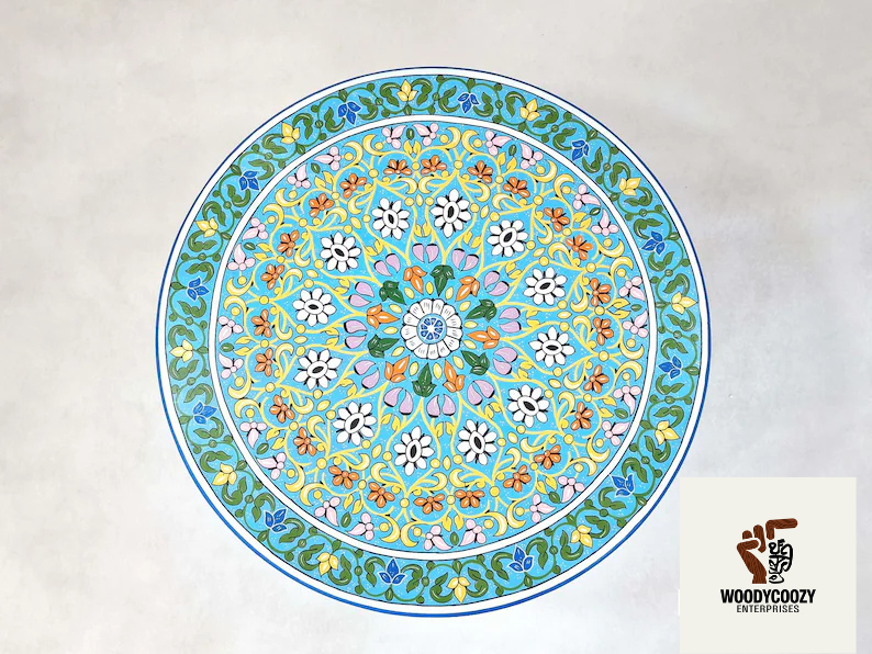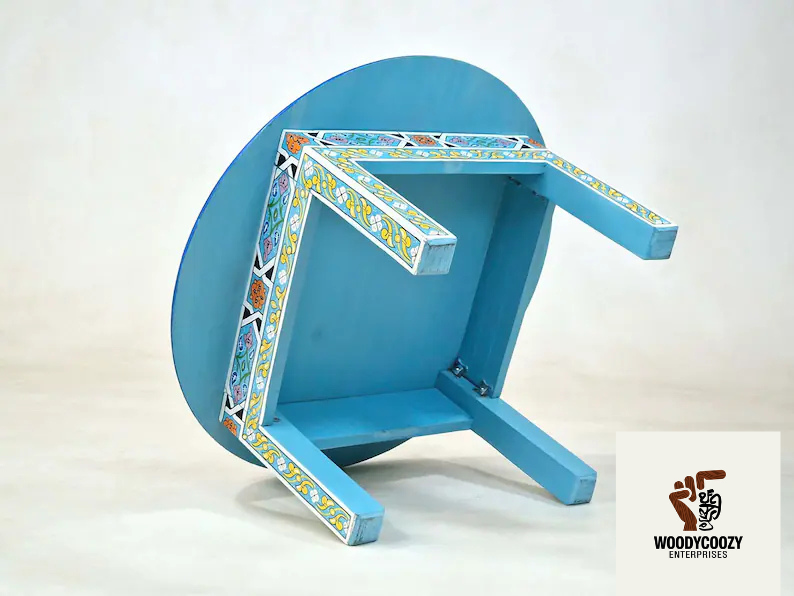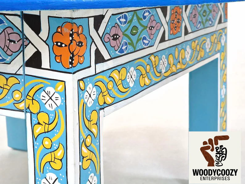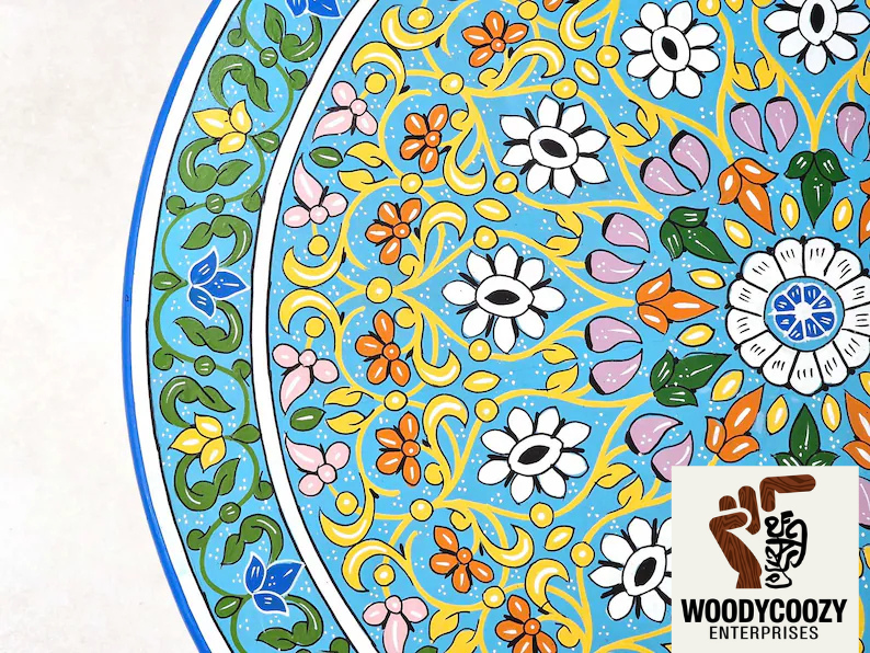 FLORAL CUSTOM TABLE – Moroccan Round Sofa Table, Hand-painted Light Blue Coffee Table, Decorative Accent Table, Berber Furniture Low Table